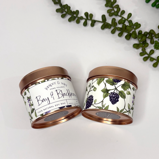 Hand Poured Soy Wax Rose Gold Candle Tin - Bay & Blackberry