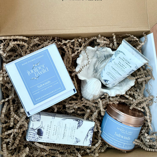 Candle Lover Gift Box – Saltwinds Coastal Scent with Stoneware Dish & Hand Cream | Hand Poured Soy Wax Candle | Vegan