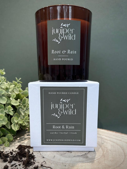 Root & Rain Soy Candle - Amber Glass Jar Hand-Poured Natural Candle | Unearthed Collection